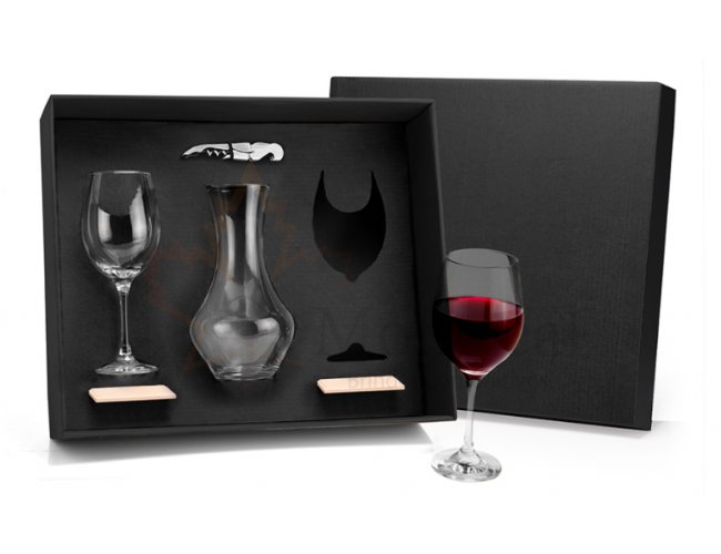 Kit para whisky e jogos. Conta com dois copos para whisky, baralho, caneta esferográfica e bloco para anotações. Estão perfeitamente acomodados em uma caixa para presentear.