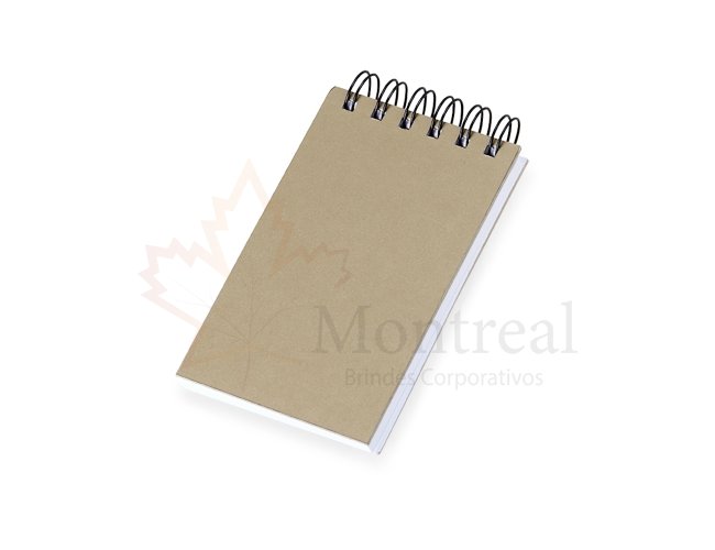 Bloco de anotações capa dura em kraft com wire-o. Contém aproximadamente 100 folhas sem pauta na cor branca.