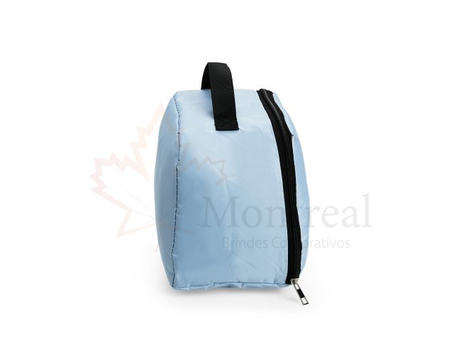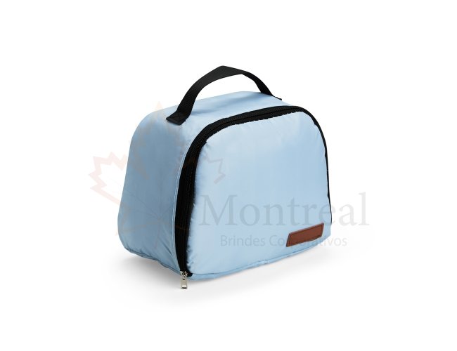 Bolsa térmica em sarja impermeável, com fechamento em zíper e capacidade máxima de 8 litros. Conta com bolso interno em tela de nylon e revestimento térmico em folha de alumínio. Além disso, possui uma pequena placa costurada feita em couro sintético e alça de nylon para transporte.