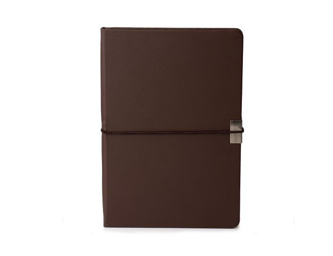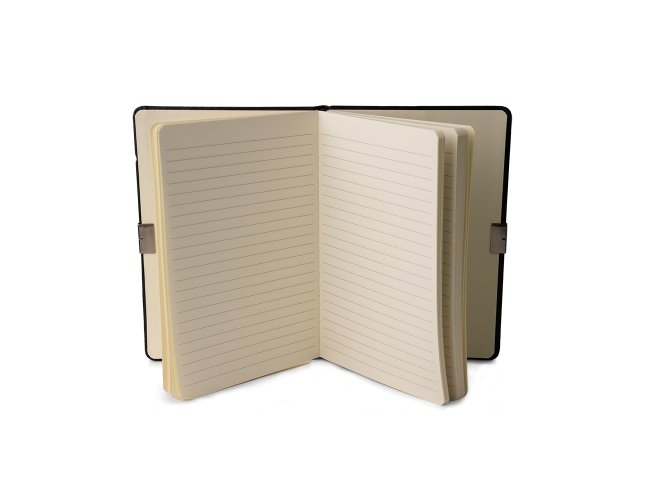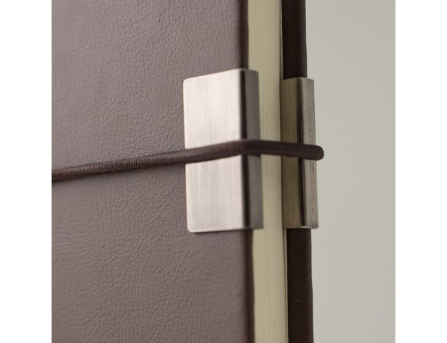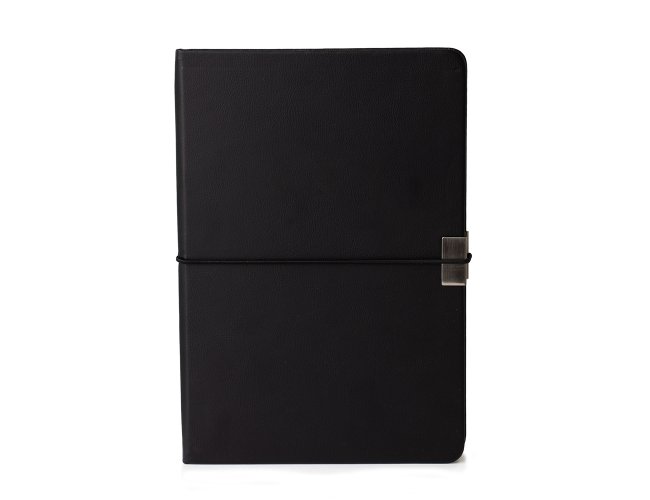 Caderneta em couro sintético com detalhe metálico, marcador de página em cetim e fita elástica para fechar. Contém aproximadamente 96 folhas marfim com pauta.