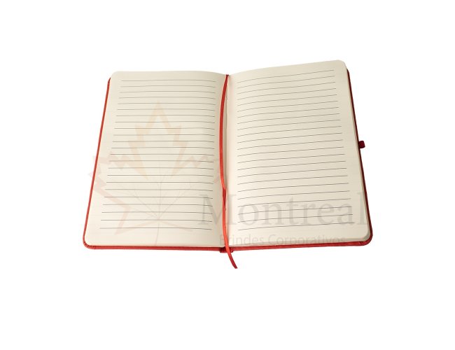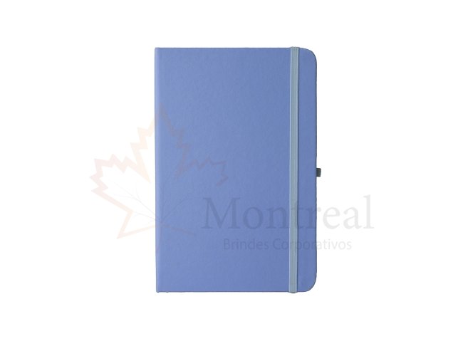 Caderneta em couro sintético com porta caneta, marcador de página em cetim e fita elástica para lacre. Contém aproximadamente 80 folhas pardas com pauta.