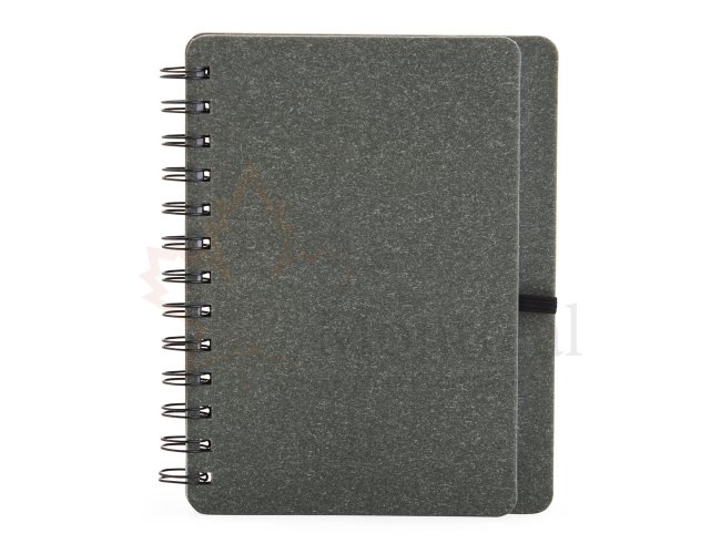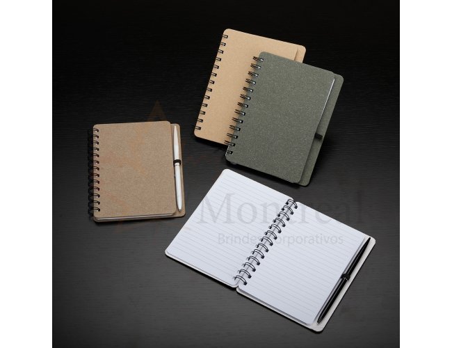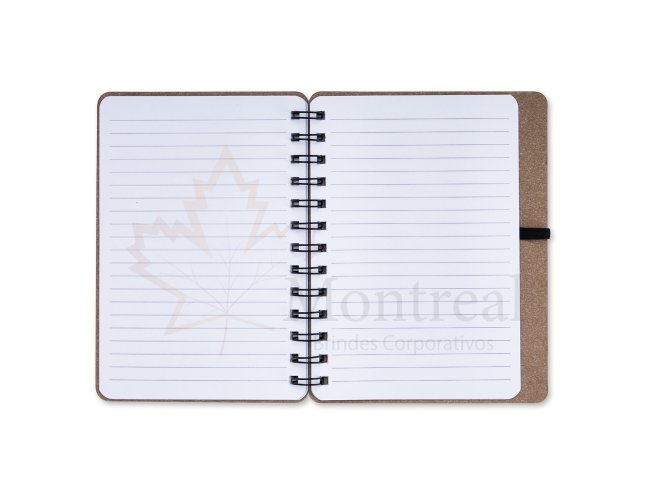 Caderno B6 capa dura em kraft com wire-o e porta caneta. Contém aproximadamente 70 páginas pautadas na cor branca.