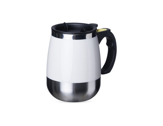 Caneca de inox com misturador de bebida, feita em parede dupla com capacidade de 350ml. Contém tampa plástica com bocal e trava de segurança. Para o funcionamento, utiliza-se duas pilhas AAA (não acompanha).