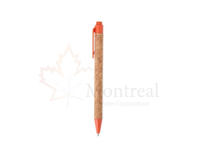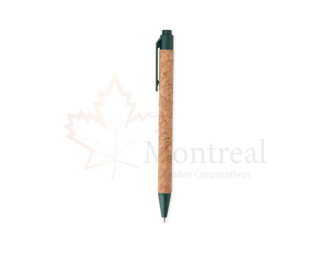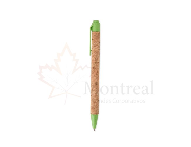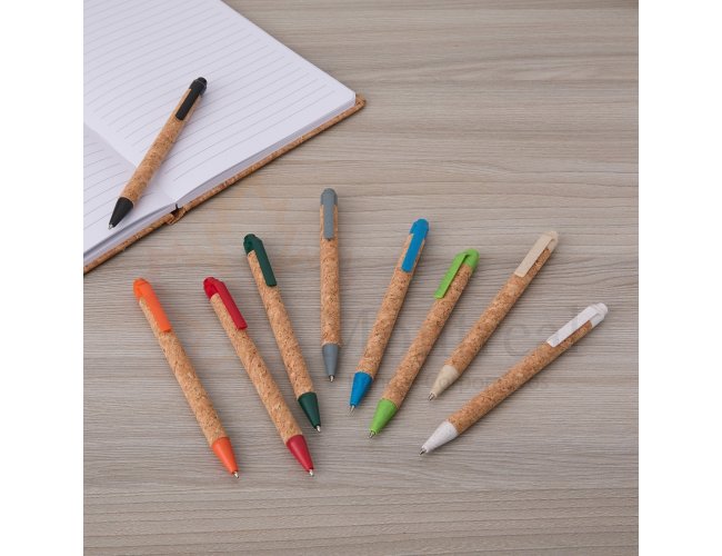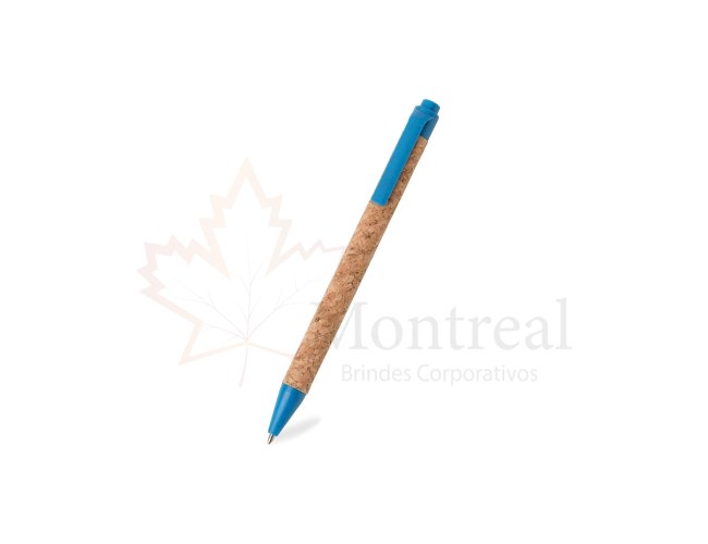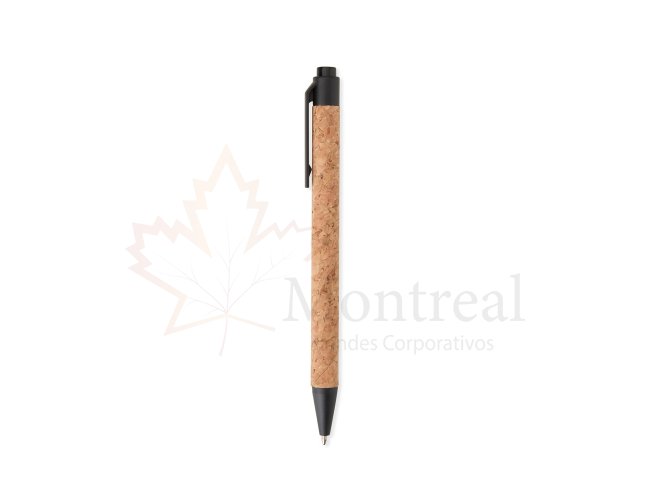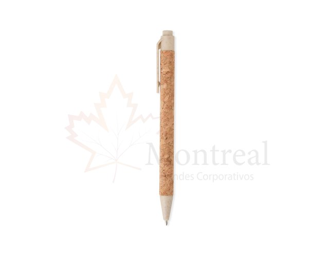 Descrição: Caneta de cortiça com detalhes em palha de trigo, carga esferográfica azul 1.0mm e acionamento por clique.