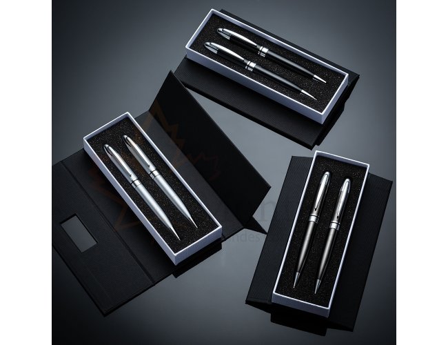 Descrição: Conjunto caneta e lapiseira em estojo de cartonagem com placa central para personalização. Clip metal e anel central possui: anel fino prata, anel preto fino e um anel maior prata com relevo e acionam por giro. Estojo revestida com espuma na parte interna.