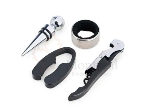 Conjunto para vinho composto por 4 peças em Inox com alumínio, sendo as peças um abridor saca-rolhas, tampão para garrafa, anel salva gotas e corta lacres. Dimensões do Produto 16,7X12,8X3,0 cm