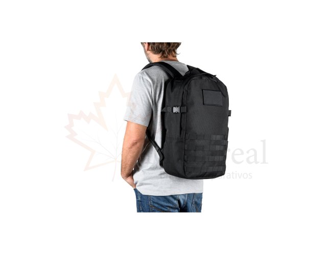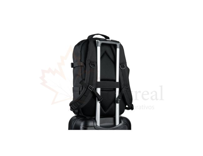 Mochila para utilização diária em ambientes profissionais ou de lazer, ideal também para esportes e caminhadas ao ar livre. O seu design torna esta mochila um produto versátil e resistente. Composta por poliéster reciclado 600D de alta densidade e forro em poliéster reciclado 210D. Possui um compartimento principal com bolso para notebook até 17.3" e diversos bolsos que facilitam a organização dos itens, um bolso com zíper e um bolso lateral. Possui características particulares como cintas de compressão nas laterais, tiras multifuncionais em webbing, alça peitoral ajustável, pega na parte superior e alça para trolley em caso de necessidade. Contém também um emblema removível, com o mesmo material da mochila, ideal para personalização. Capacidade até 21 L. 310 x 470 x 150 mm