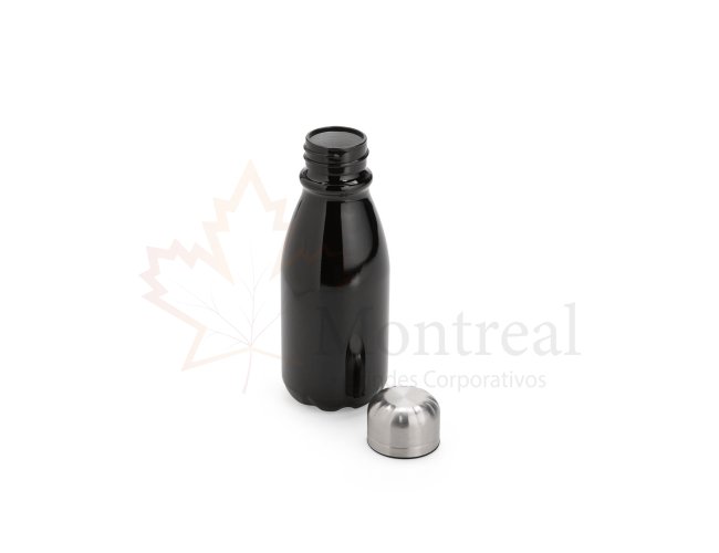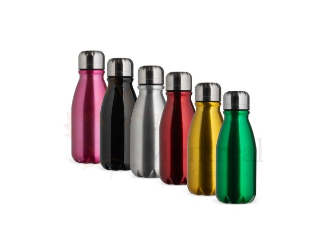 Garrafa em alumínio com tampa rosqueável e capacidade máxima de 400ml.