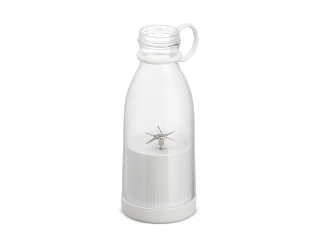 Mini liquidificador portátil com capacidade de 380ml. Contém tampa rosqueável plástica com alça emborrachada para transporte, ventoinha inox 6 lâminas e base plástica com borrachas antiderrapantes. Acompanha cabo USB. Obs. (Para o funcionamento do produto a quantidade total de frutas/água adicionadas não deve exceder 300ml).