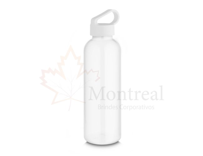 Garrafa *RPET com capacidade de até 550ml, tampa plástica com alça integrada.