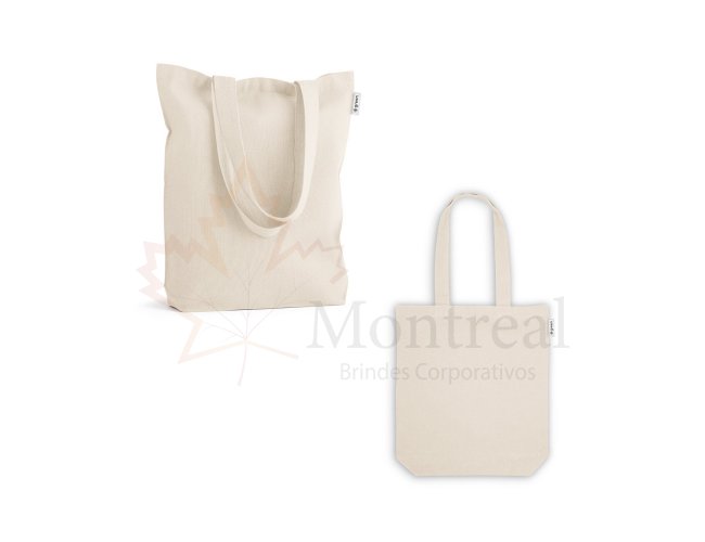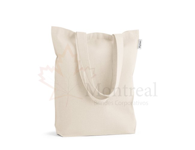 Sacola em 50% algodão, 30% algodão reciclado e 20% poliéster reciclado (220 g/m²), com alças de 62 cm. 380 x 400 x 100 mm