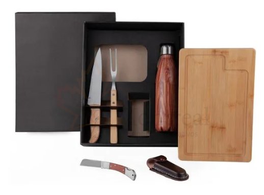 Kit churrasco com garrafa e canivete. Conta com tábua para churrasco/cozinha em bambu, garrafa em aço inox com pintura amadeirada, faca 7" em madeira/inox, garfo trinchante em madeira/inox e canivete.