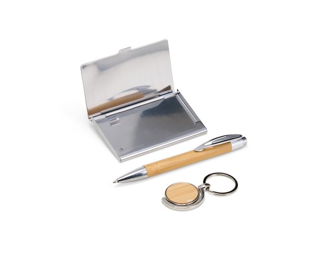 Este kit é a escolha perfeita para quem busca sustentabilidade no dia a dia. Ele inclui: um porta-cartão com tampa de bambu e interior em metal brilhante, combinando resistência e sofisticação; um chaveiro giratório em metal com frente de bambu e verso espelhado, trazendo modernidade; e uma caneta de bambu com clipe metálico, acionamento por clique e carga esferográfica azul, prática e estilosa. Todos os itens são cuidadosamente acomodados em um estojo de papelão com tampa e interior de espuma, ideal para presentes ou para organizar seus itens com cuidado. Uma escolha que alia sustentabilidade, elegância e utilidade em um único conjunto!