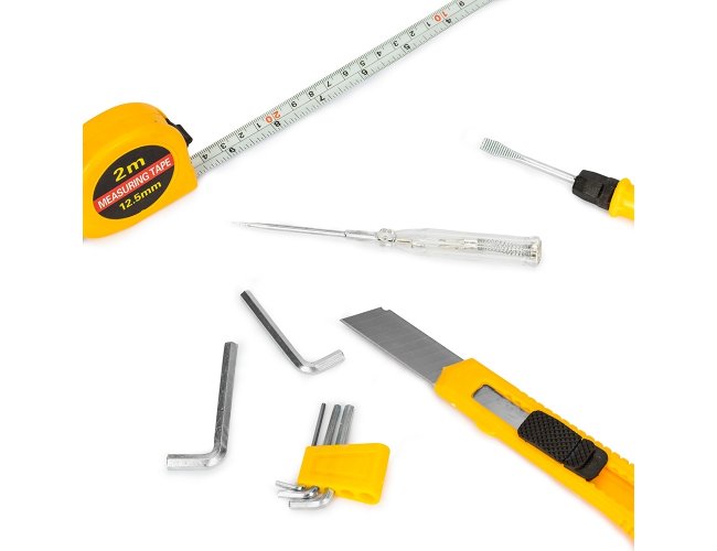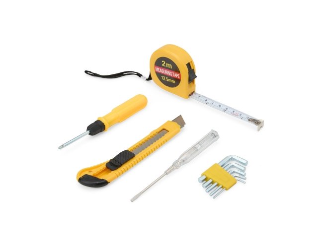 Este kit de ferramentas foi desenvolvido para facilitar o seu dia a dia, oferecendo praticidade e agilidade nos pequenos reparos. Composto por chave de fenda teste, chaves Allen em diferentes tamanhos, estilete, fita métrica de 2 metros e uma chave dupla, com ponta de fenda e Phillips, garantindo tudo o que você precisa para lidar com imprevistos de forma rápida e eficiente. Seu acabamento em plástico resistente garante durabilidade, proporcionando a confiança necessária para resolver qualquer situação com facilidade.