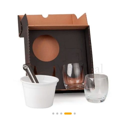 Kit para whisky. Conta com dois copos para whisky em vidro, pegador para gelo em aço inox e balde para gelo 750 ml em alumínio branco.