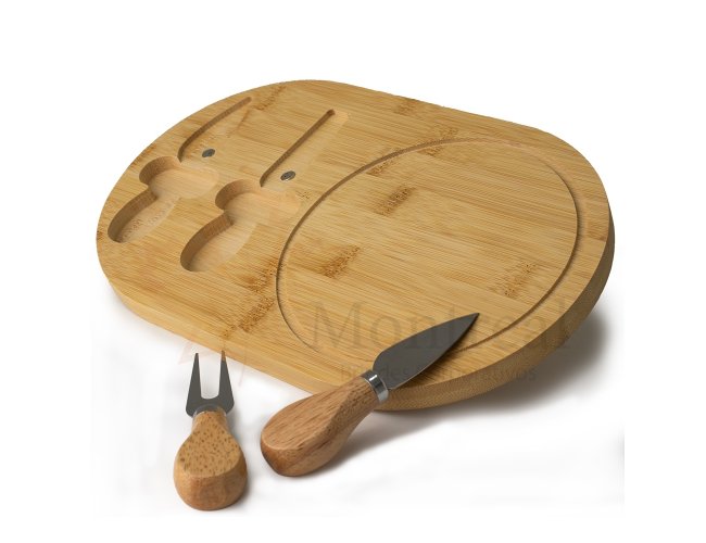 Kit queijo 3 peças, contém: tábua de bambu com canaleta, faca com ponta e garfo. Tábua com imã para encaixe e fixação dos utensílios.