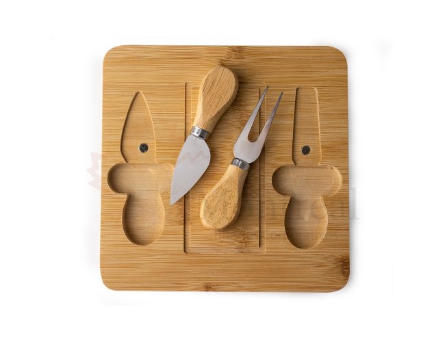 Kit queijo 3 peças, contém: tábua de bambu com canaleta, faca com ponta e garfo. Tábua com imã para encaixe e fixação dos utensílios.