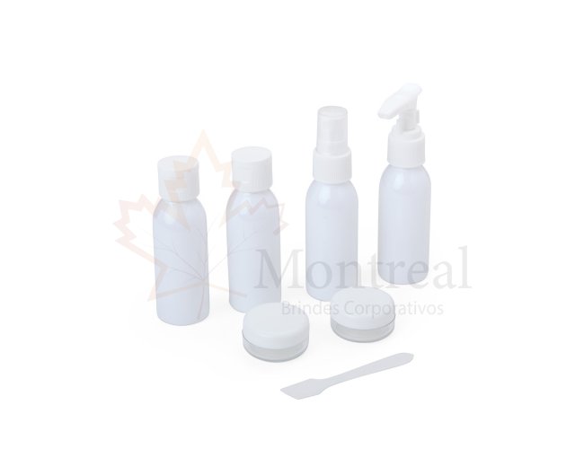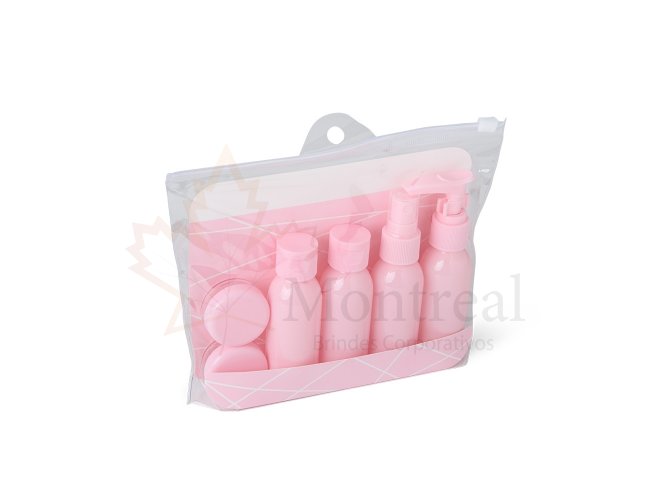 Descrição: Um kit para viagens que traz mais praticidade na hora de transportar itens de cuidados pessoais de maneira compacta. O conjunto, que vem em um estojo ziplock, conta com 1 frasco pump de 50ml, 1 frasco spray de 50ml, dois frascos com tampa rosqueável de 50ml e 2 potes de 5ml.
