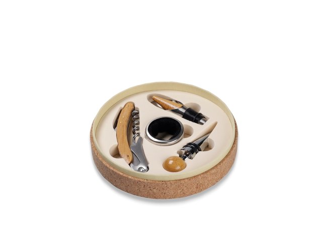 Kit vinho 4 peças com estojo em cortiça, parte interna revestida de espuma. Possui tampa de bico, saca rolha, bico condutor com tampa e wine collar.
