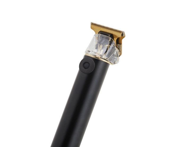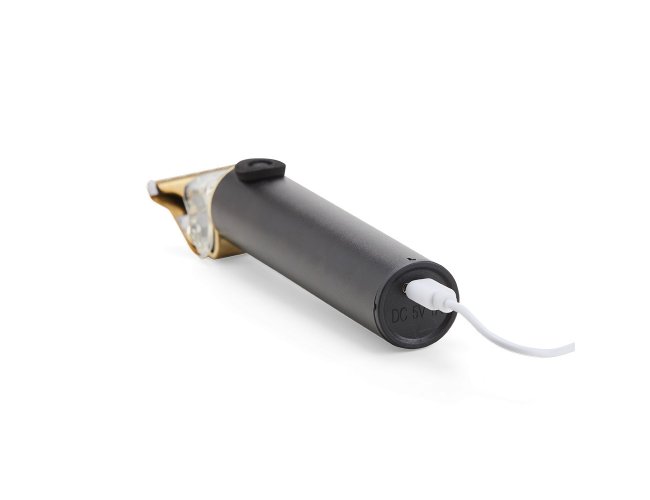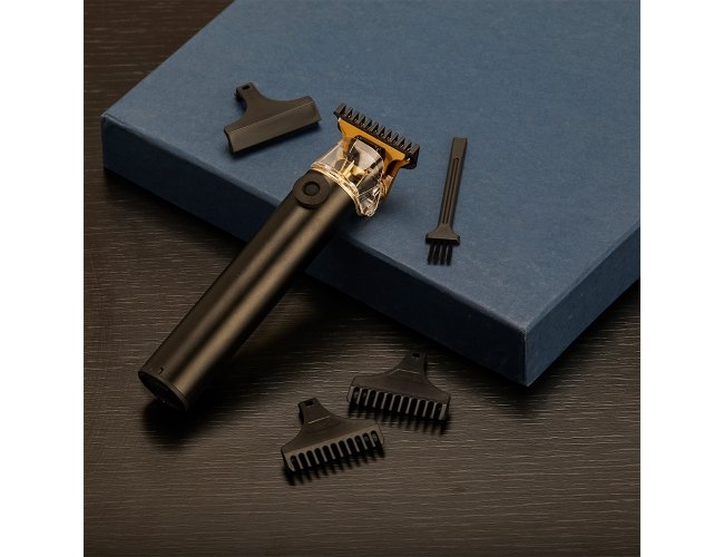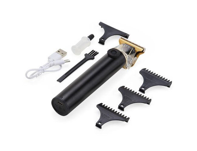 Máquina de cortar cabelo recarregável com lâminas em aço inoxidável, tampa plástica e corpo de alumínio. Acompanha 4 pentes plásticos (1mm, 2mm, 3mm e pente de proteção para as lâminas), escova de limpeza, óleo lubrificante e cabo USB-Tipo-C.