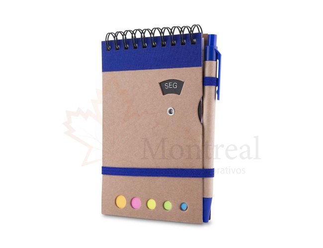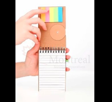Mini Caderno com capa em papel kraft, com 70 folhas pautadas e blocos adesivos (sticky notes) coloridos. Acompanha disco rotativo na capa com os dias da semana e caneta produzida em papelão reciclado com detalhes em plástico e escrita em azul.
