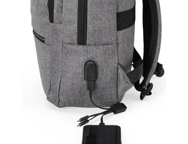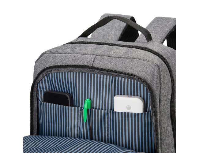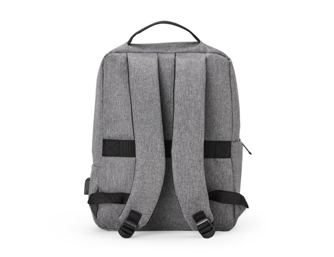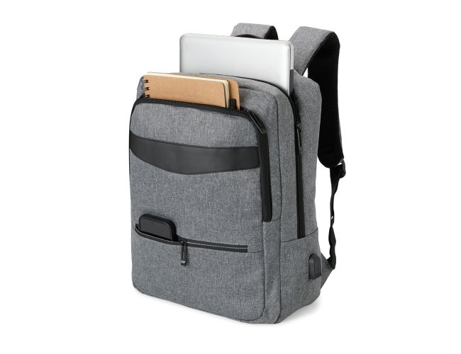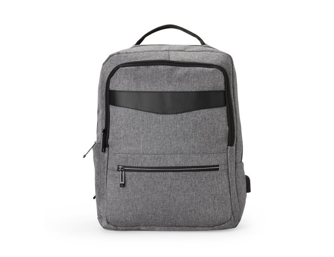 Mochila de nylon 22 Litros com detalhes em couro sintético e três compartimentos, sendo o principal com bolso para notebook 15,6. Mochila possui bolso lateral e suporte externo usb.