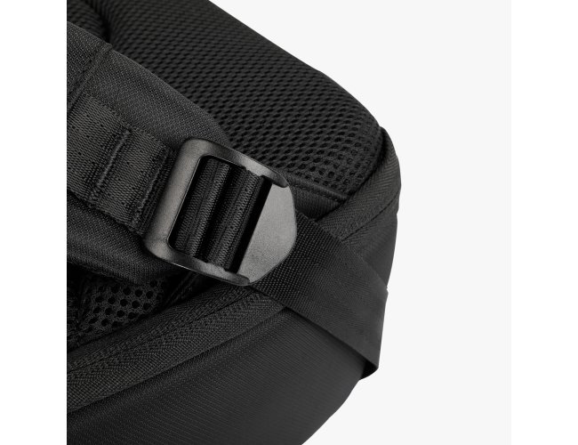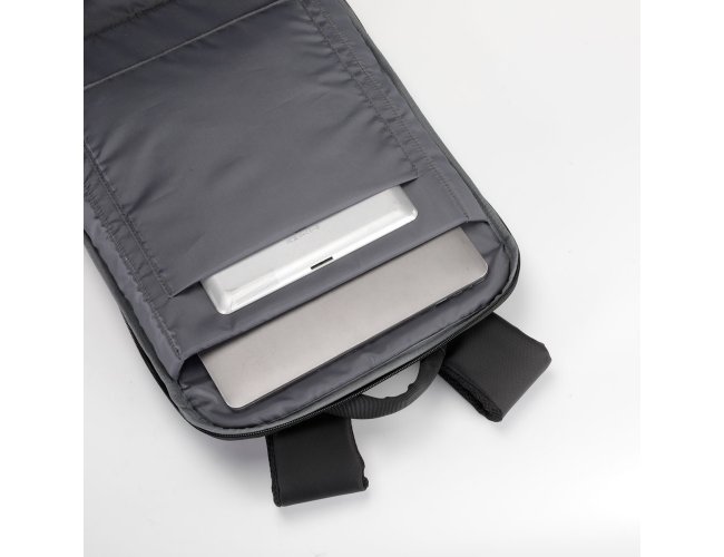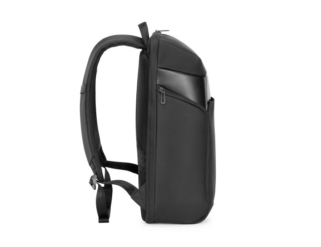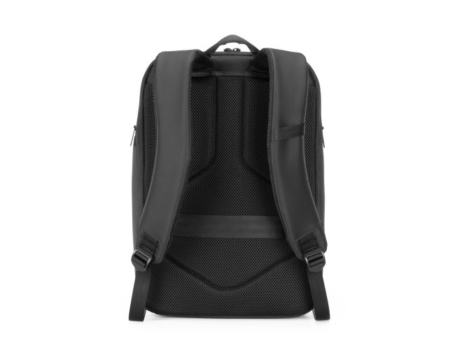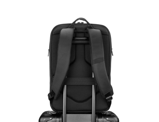 Mochila de 25 litros premium em poliéster impermeável com quatro compartimentos, sendo um deles para notebook 15,6 e tablet 10,5. Com divisórias internas para documentos e bolso telado com zíper, a mochila possui adaptador USB externo, área costada e alças para as costas com revestimento espumado e alça de engate paa malas de viagem.