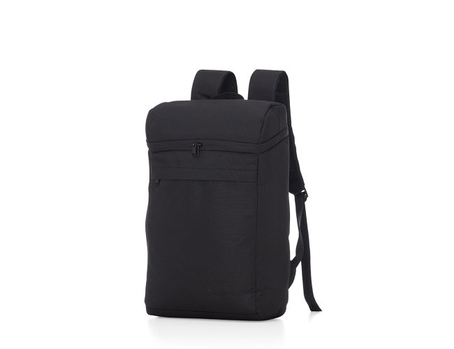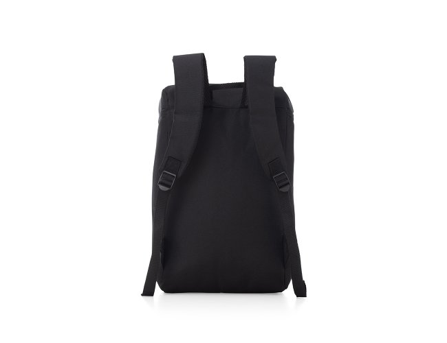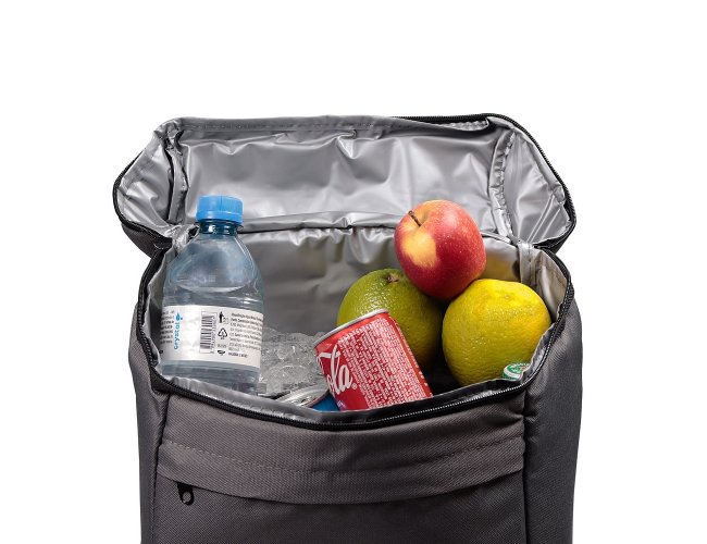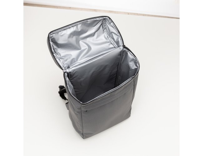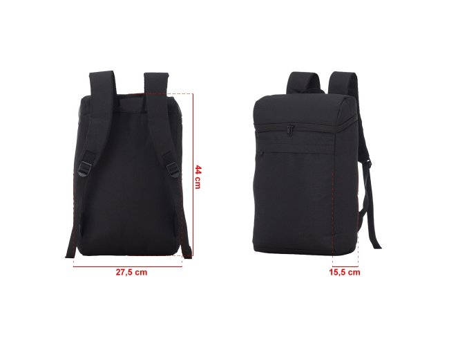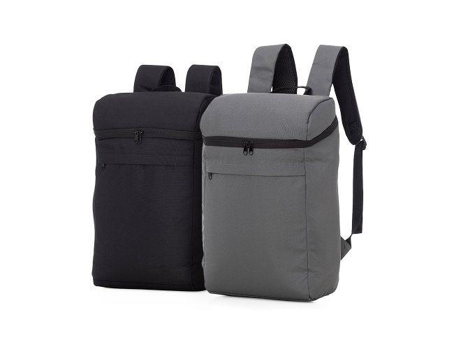 Mochila térmica 17L confeccionada em poliéster, possui bolso frontal com zíper, alça para as mãos em nylon, e alça para as costas ajustáveis com revestimento antitranspirante.