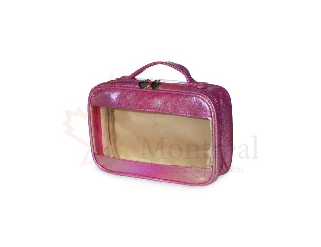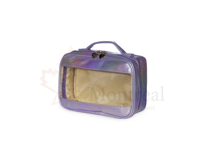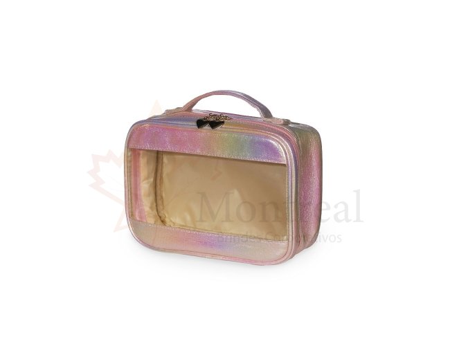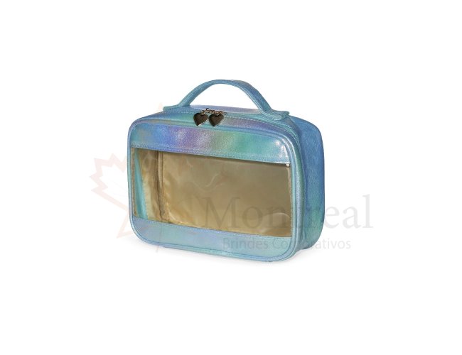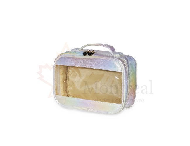 Descrição: Nécessaire de pvc e tecido sintético com design holográfico, resistente à água.