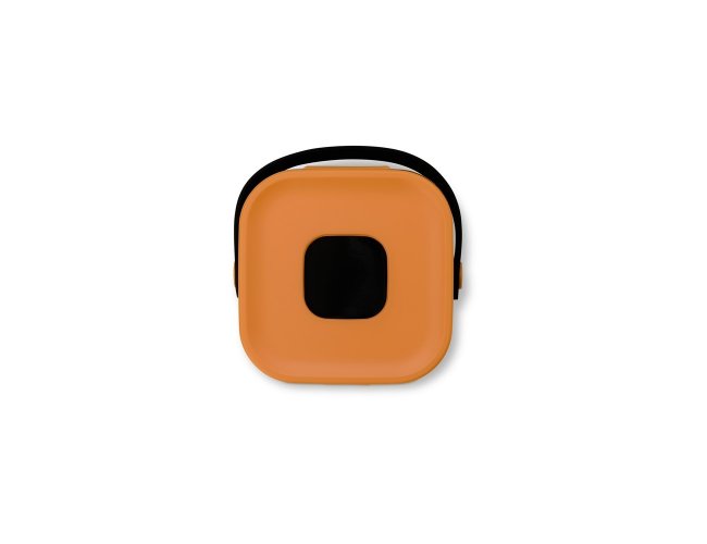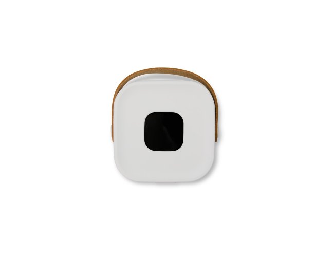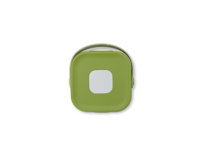 Porta-joias com espelho, produzido em plástico com alça de couro sintético e berço de silicone removível.