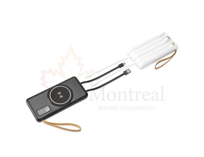 Power Bank em plástico com capacidade de 10.000mAh. Possui quatro cabos integrados com saídas para Lightning, USB-C, Micro-USB e USB, além de área de recarga por indução magnética para dispositivos compatíveis e lanterna de LED. Conta ainda com entradas USB-A e USB-C para recarga do próprio aparelho e alça de tecido sintético para transporte.
