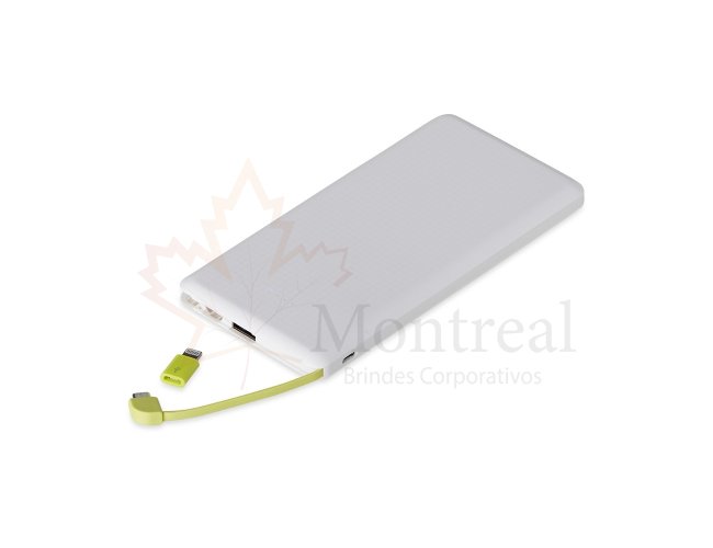 Carregador portátil plástico com 10.000mAh e indicador led de bateria. Possui entrada V8, acompanha cabo USB, adaptador lightning e adaptador tipo-C.