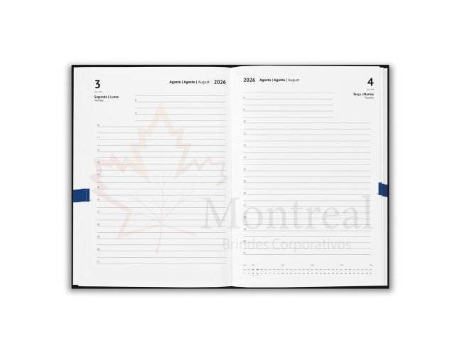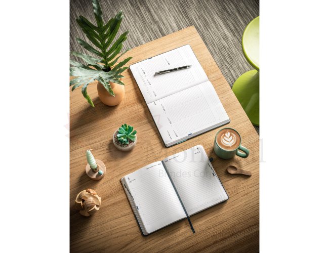 Agenda B5 em cortiça e linho. Possui um suporte para esferográfica (não inclusa), marcador em fita e elástico para fecho na mesma cor. Está organizada num plano diário (70 g/m²). Fornecida com bolsa de non-woven. 148 x 210 mm | Bolsa: 205 x 250 mm