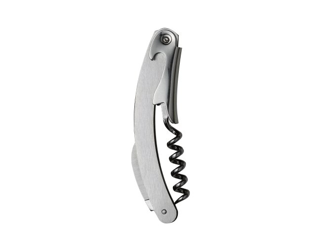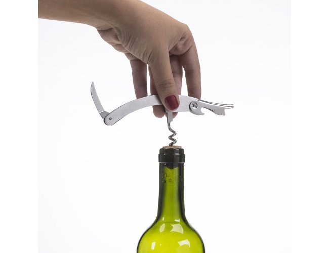 Saca-rolhas metálico com lâmina de corte e abridor de garrafa.