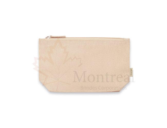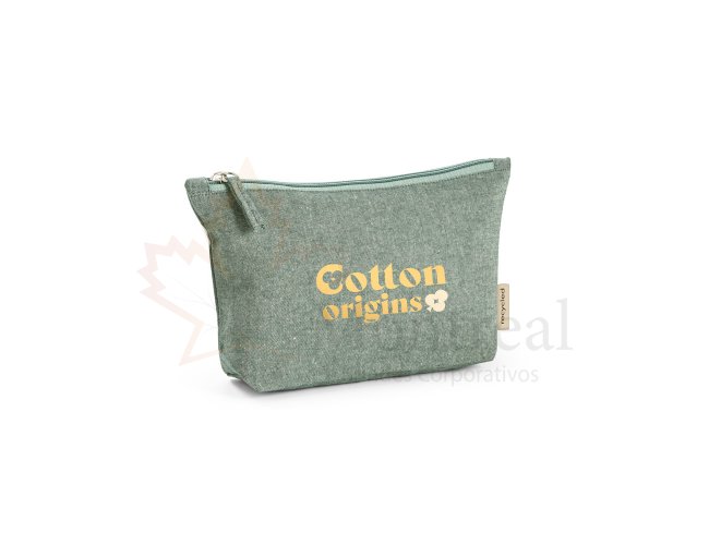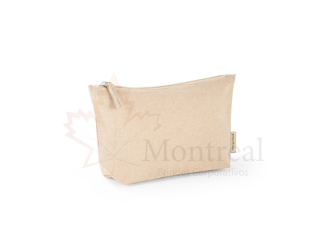 Bolsa multifunções em 70% algodão reciclado e 30% poliéster reciclado (140 g/m²). Interior com forro 100% algodão. 250 x 140 x 60 mm
