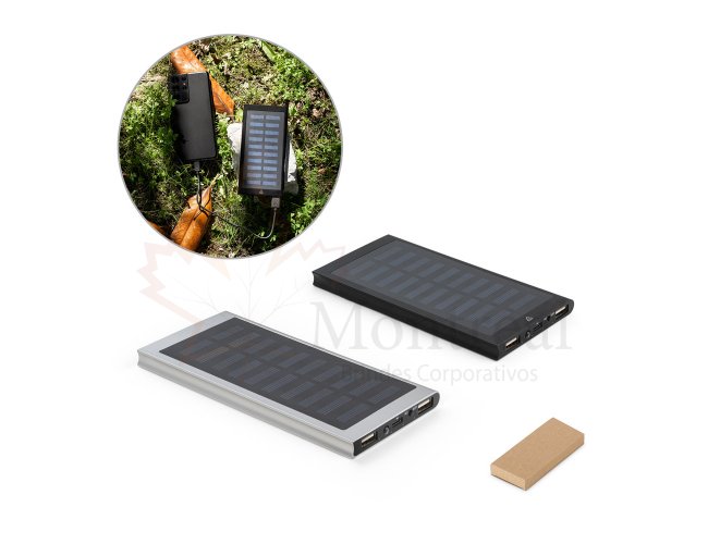 Bateria portátil em alumínio 100% reciclado. Bateria em lítio, com painel solar e lanterna. Tem capacidade de 8.000 mAh
